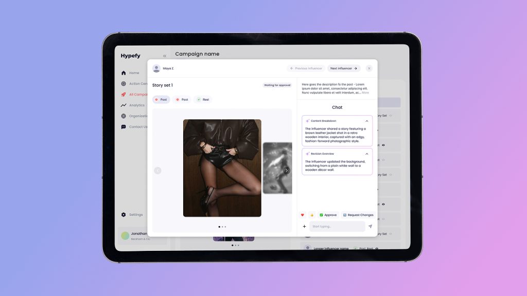- When an influencer uploads content to Hypefy, the AI immediately checks it for key points (brand mentions, required hashtags, call-to-action). Does ti comply with your brief, is the hook catchy enough, is the product too-salesy? All that and more is crunched and ends up in your final review.
